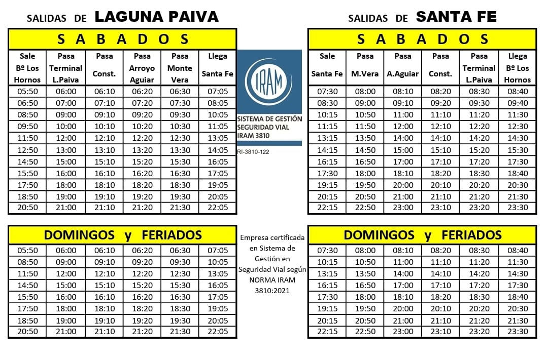Horarios entre SANTA FE Y MONTE VERA POR RUTA 2EMPRESA LAGUNA PAIVARevisado 29/12/25