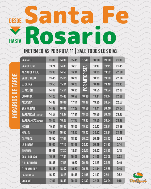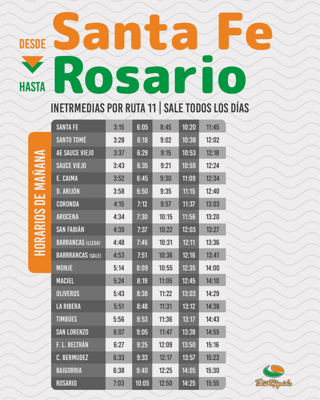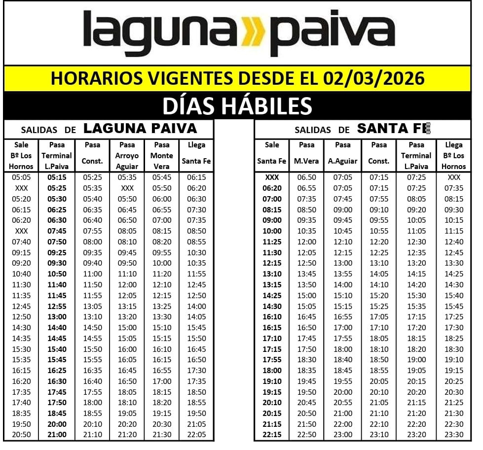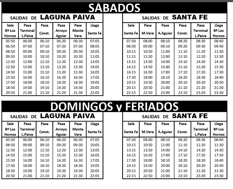 Horarios entre SANTA FE Y LAGUNA PAIVA, POR RUTA 2